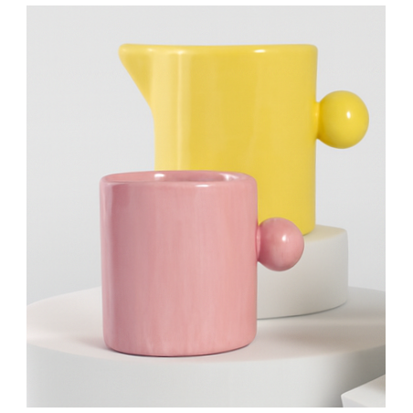 Elaborada en cerámica de baja temperatura, destaca por su color amarillo suave, luminoso y acogedor, que aporta un punto de luz y alegría a la mesa sin resultar estridente. Su asa en forma de esfera, sello distintivo de esta línea, añade un toque escultórico y delicado, invitando a interactuar con la pieza desde lo sensorial y lo visual. Es un detalle pequeño, pero cargado de personalidad.